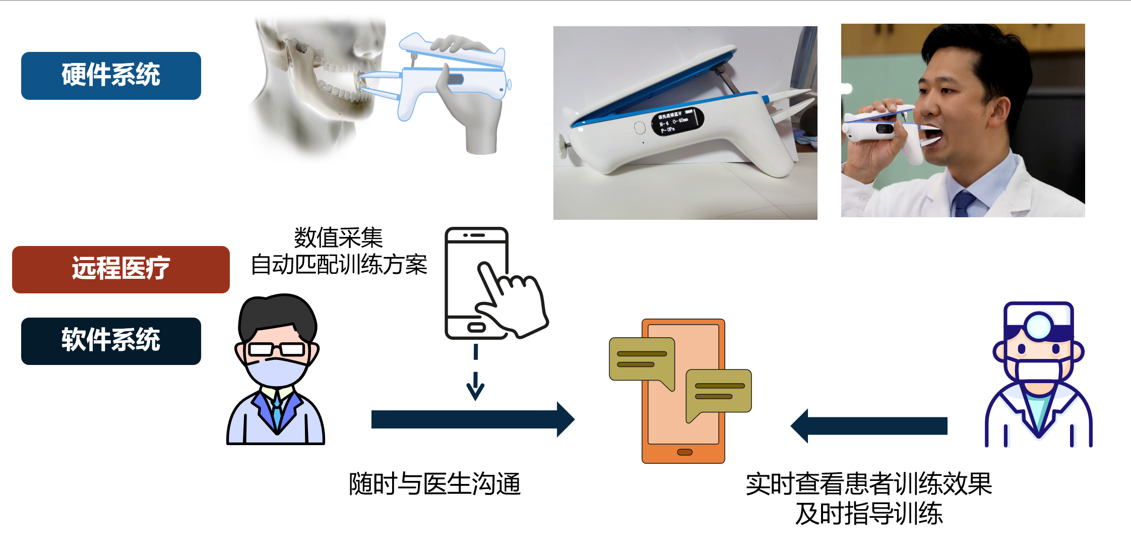 先天性疾病 牙关紧闭假屈曲指综合征后天性疾病 颊黏膜癌 髁突骨折整容过度 瘦脸针 削骨瘦脸 张口康复训练系统 张口康复训练系统通过模拟下颌的自然运动轨迹,手动被动持续往复运动,更好地激发人的自然复原力,发挥组织代偿作用,恢复颞下颌关节和相关组织功能,从而恢复口腔张口,进食和语言交流功能。它还包括保护牙齿的咬合板(垫),以及监测和检查康复过程的电子系统和手机小程序。 智能下颌康复训练器:整体思路 创新点训练过程和效果可量化、记录和追溯,可持续训练;非单纯机械器械,全智能系统,“张口训练+个性化方案定制+云平台”三位一体康复模式,可制定个性化训练方案;训练过程可监控,避免二次伤害,安全性高。技术优势机械结构与电路有效融合,外观小巧美观;后端功能丰富实用,贴近临床需求,集测试、康复、保护、云端调查问卷管理、智能设备和云管理6大功能为一体;该训练方式已经成为专家共识。 市场前景 当前市场(1)发病率高:张口受限发病率高,每年国内10万新发病例,有着巨大的市场发展空间。(2)传统训练效果欠佳:传统张口器均为单纯的机械性结构,训练效果和过程无法量化,无法保证安全性,康复效果较差。(3)独特性:目前,国内外尚无智能张口康复系统同类产品,不存在产品竞争。 应用前景(1)技术先进性:“张口训练+智能方案+云平台”三位一体的工作模式,可有效提高患者依从性,使广大患者居家即可实现定制式、实时口腔康复指导与训练。(2)经济价值良好:经第三方评估,预计单套售价2000元/套,远高于每套300元的物料成本,能实现较高的盈利。(3)重大社会效益:为规范张口训练流程,优化张口训练方案及制定张口康复指南奠定基础。